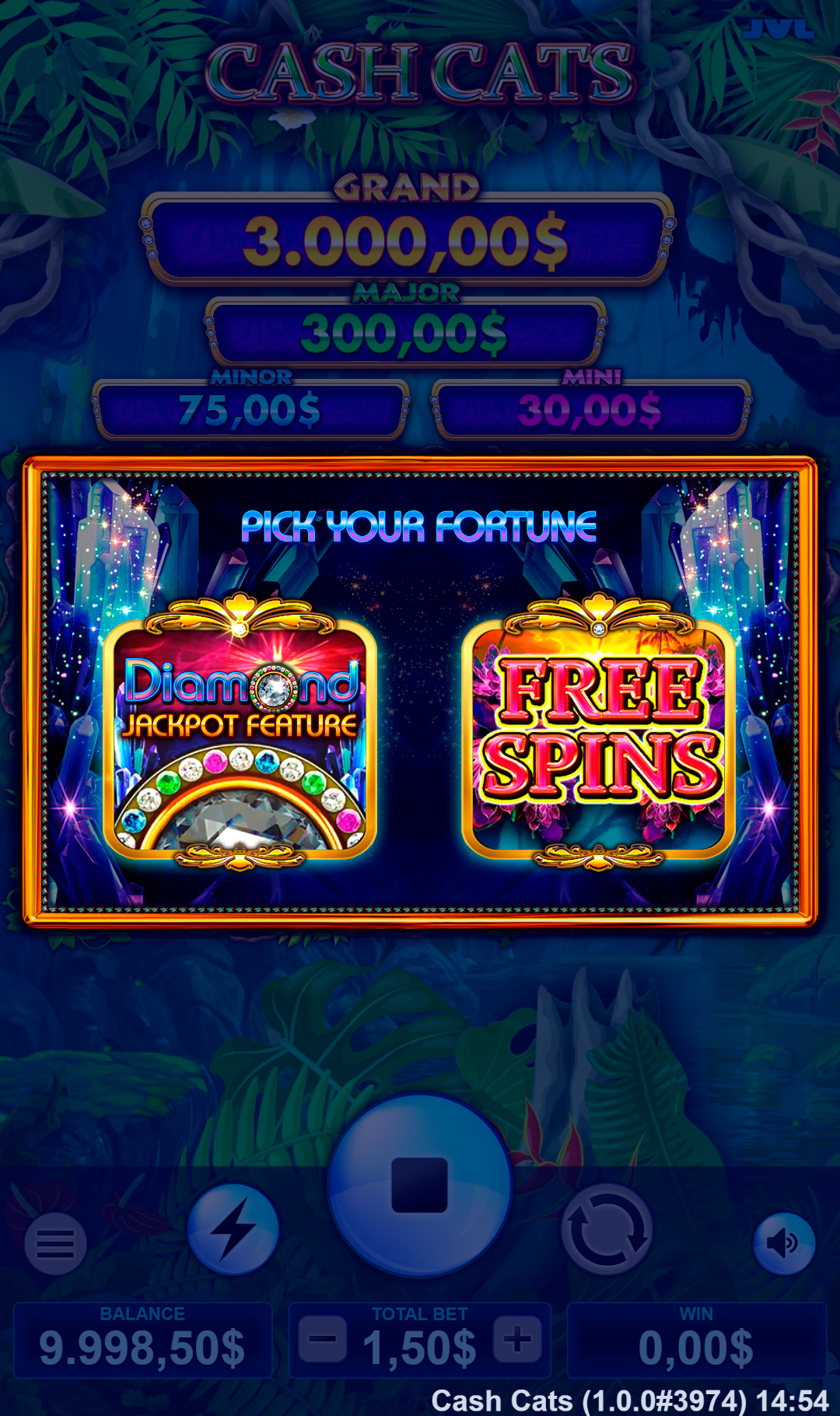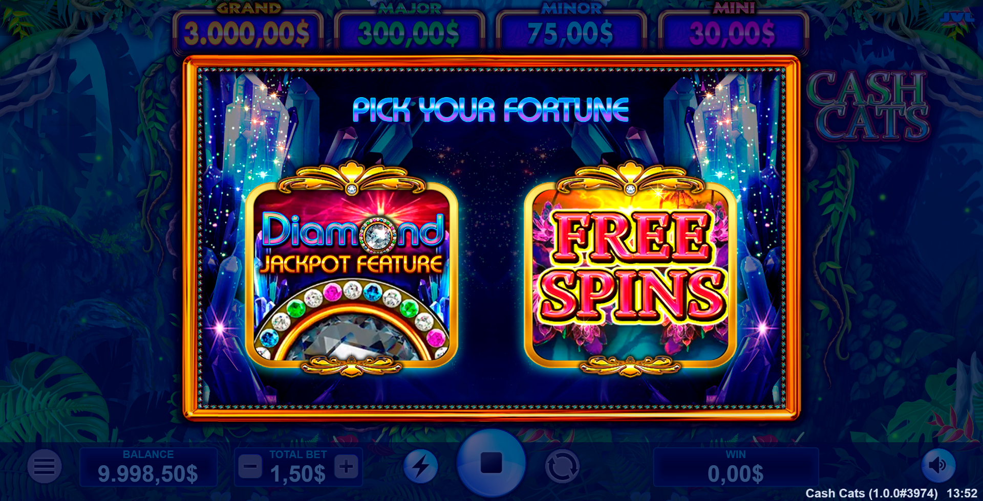 Triggered by 3 scattered CASH CAT LOGO symbols on reels 2–4. Players choose between two features: the Pick a Wild Pattern Free Spins or the Diamond Bonus.