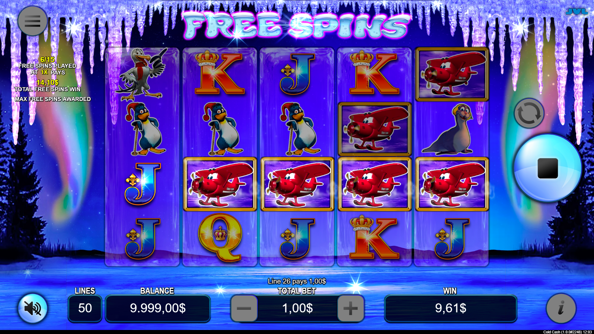 Trigger 10 free spins by landing 3 FISH symbols on reels 1, 2, and 3. During free spins, any PLANE wild that appears locks in place for the remainder of the feature. The round can be retriggered once, for up to 15 total spins.