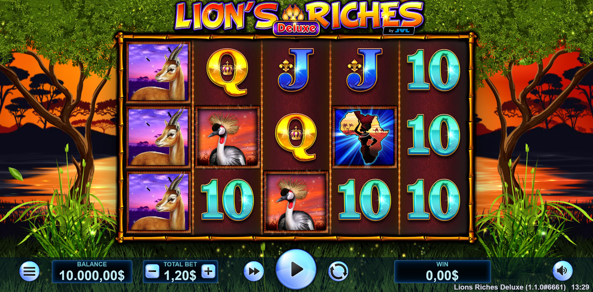 Across golden plains and beneath a setting sun, the lion surveys his kingdom — proud, silent, and powerful. Lion’s Riches Deluxe transports players to the heart of the savanna, where each pawprint holds the promise of royalty. With every spin, the king of beasts guards his treasure, challenging players to prove their worth. Choose your fate by revealing the symbol that will rule your reels during free spins.