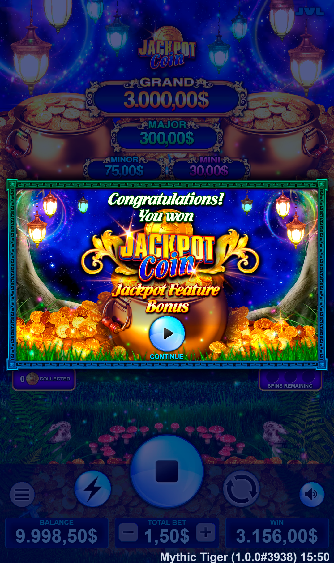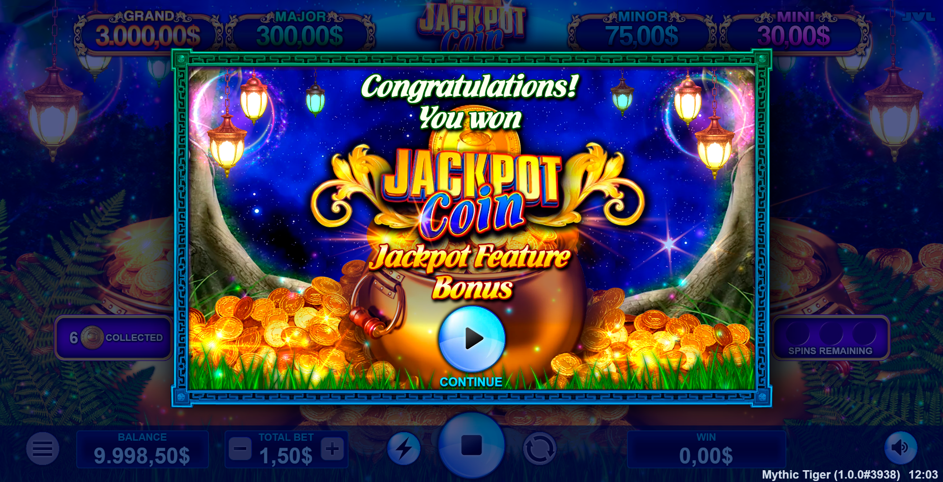Triggered when 6 or more COIN symbols land. Coins lock in place and award 3 respins. Each new coin resets the counter. Fill all 15 positions to win the GRAND jackpot. Other prizes include credits or MINI, MINOR, MAJOR jackpots.