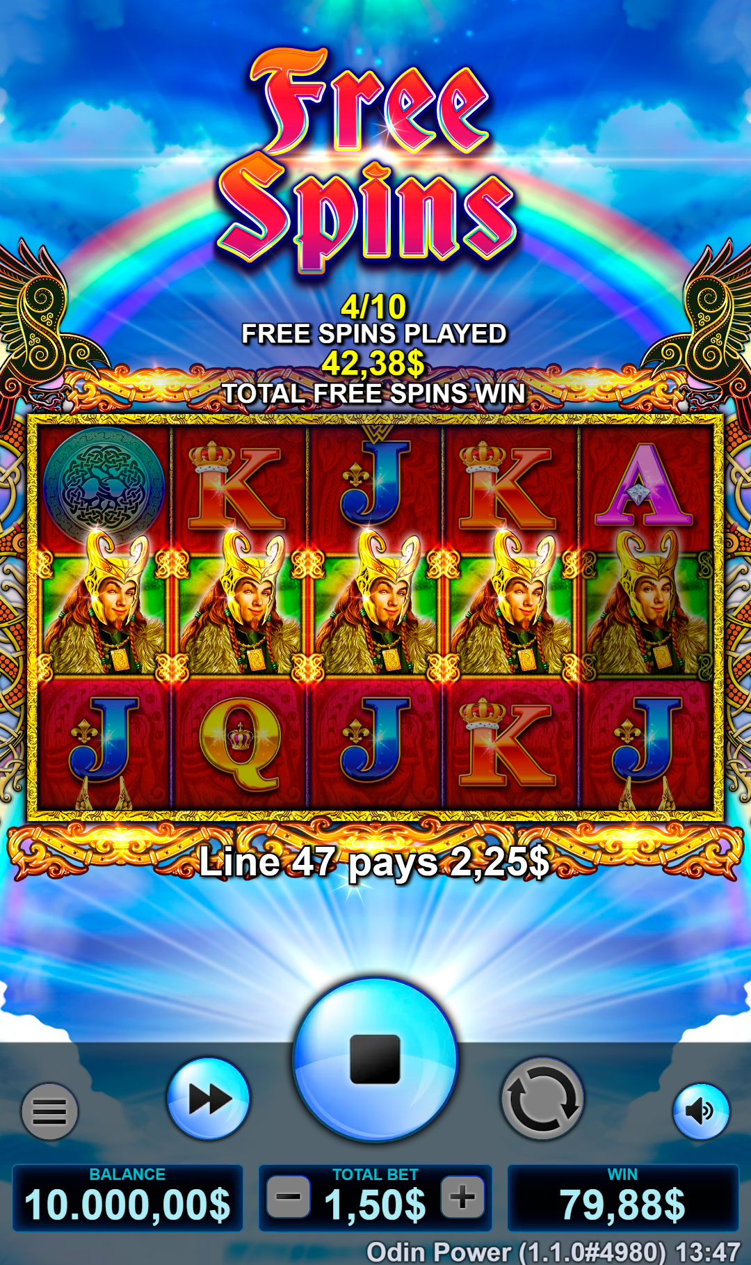 Trigger 10 free spins by landing 3 or more ODIN POWER logos. During the feature, ODIN wilds landing on reel 3 lock for the duration. Additional YGGDRASIL symbols are added with enhanced payouts.