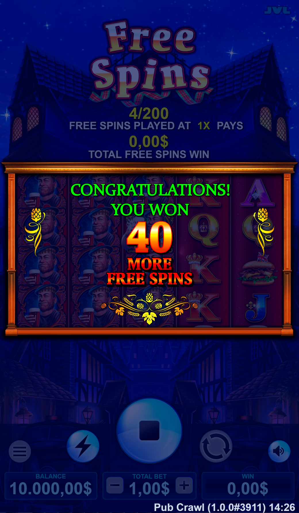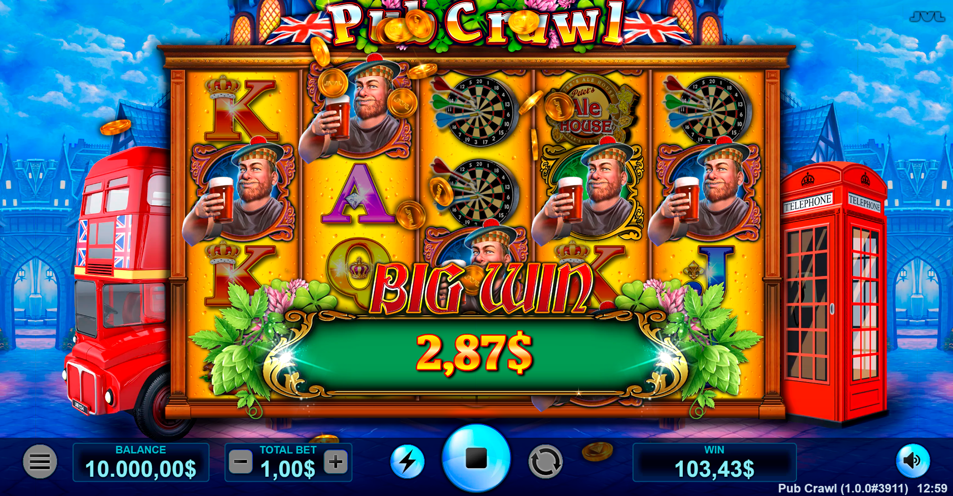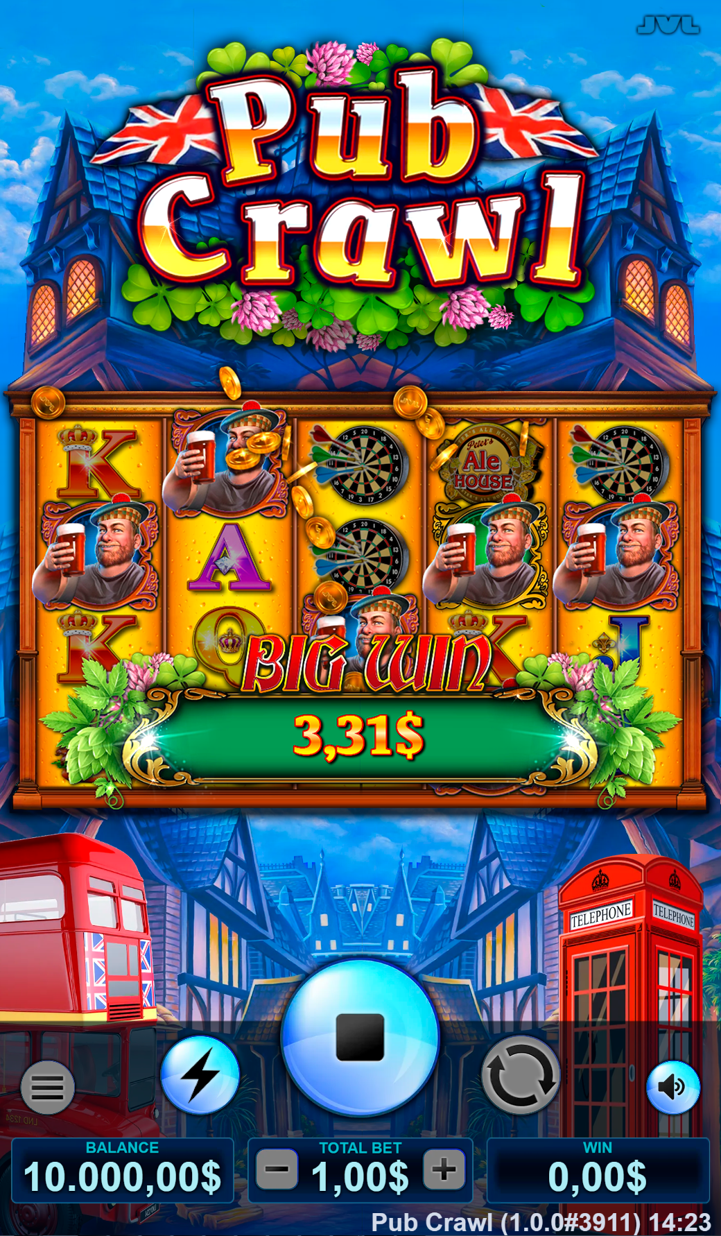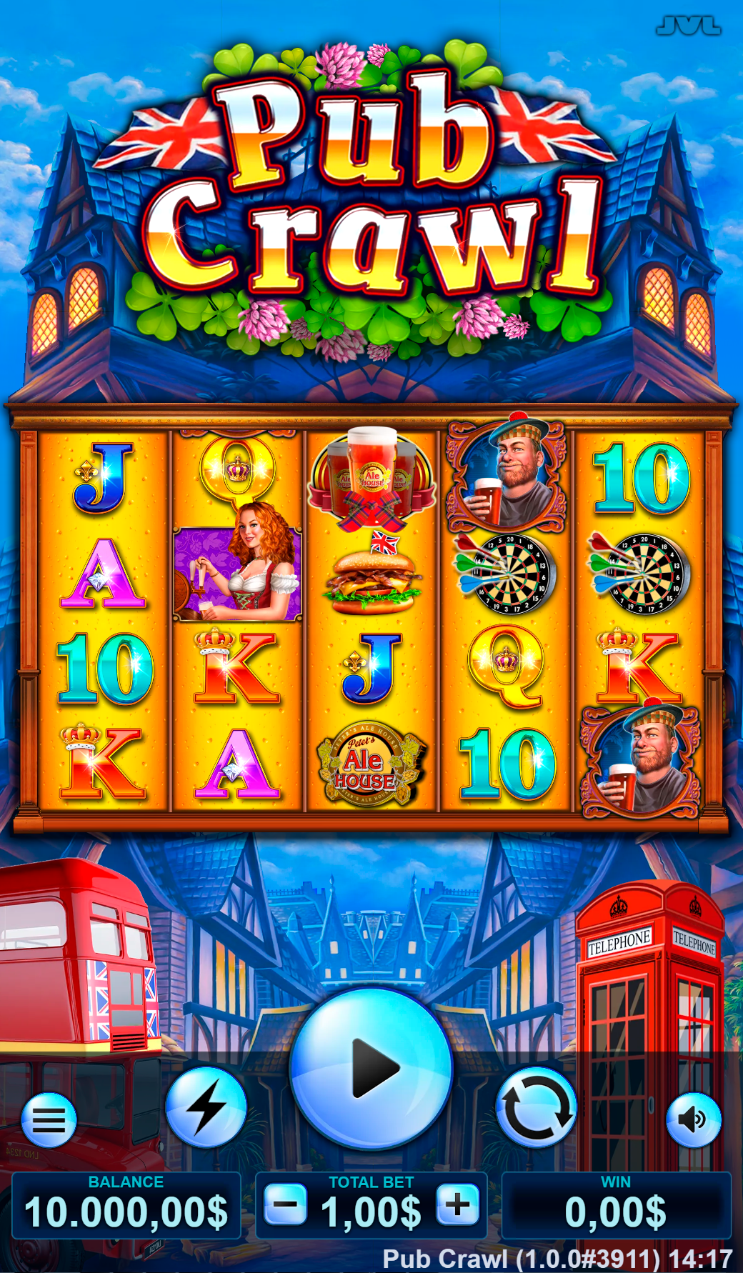 Down cobbled streets and into fire-lit pubs, Pub Crawl leads players through a tour of classic English alehouses. From dartboards to beer taps, the game bubbles with warmth, laughter, and layered pints of red ale. As the reels spin, cheerful patrons and glinting steins fill the bar with life and promise.