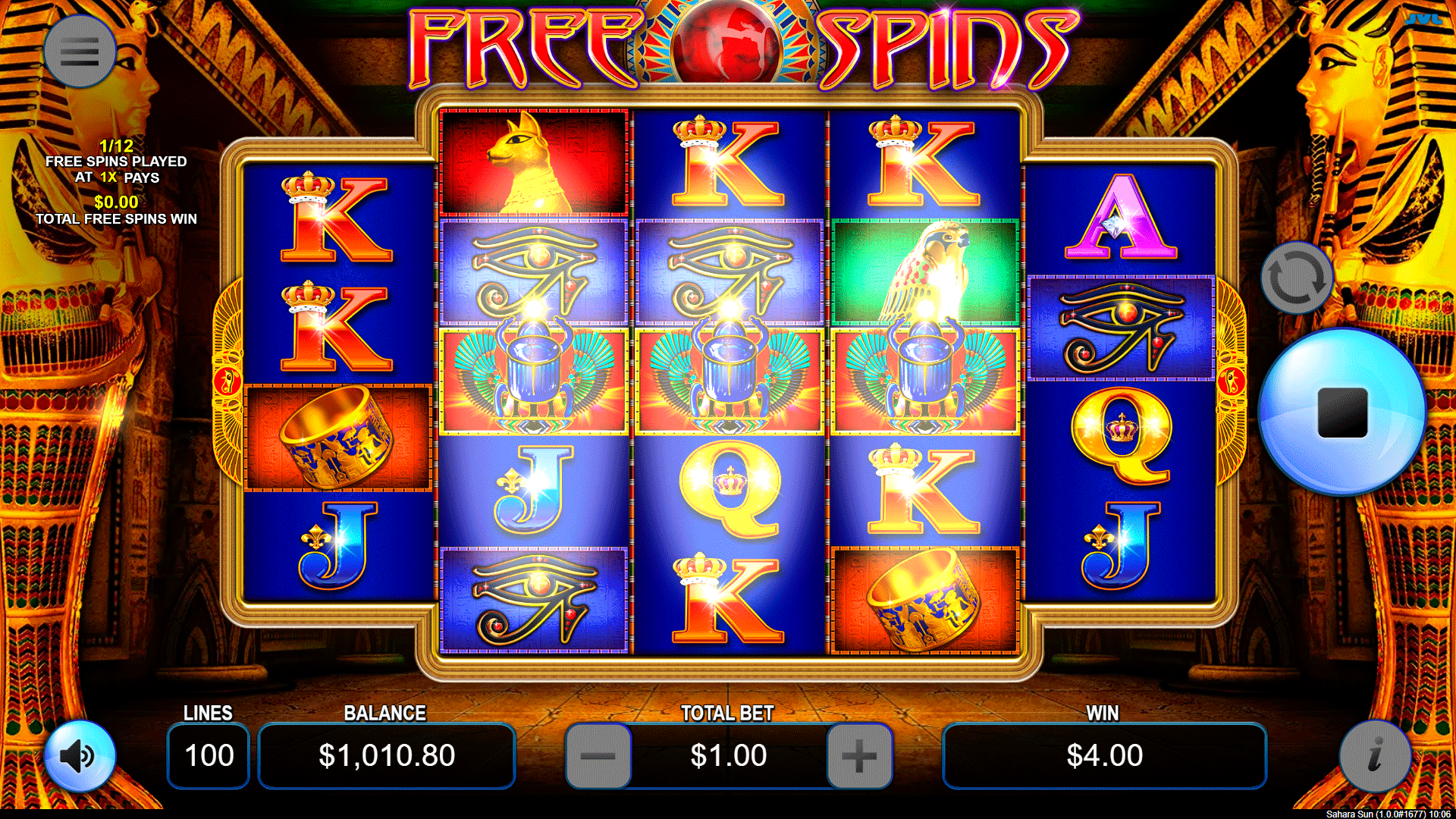 Land 3 TUT symbols on reels 2, 3, and 4 to trigger 12 free spins and an instant prize of 4x total bet. Free spins include expanding wilds on all reels for massive win potential.